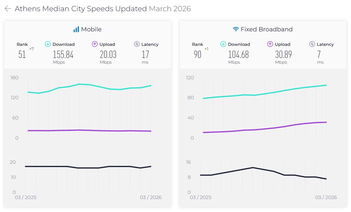 Στην Αθήνα, οι ταχύτητες κινητής φτάνουν τα 155,84 Mbps στο download και 20,03 Mbps στο upload, με latency 17 ms.