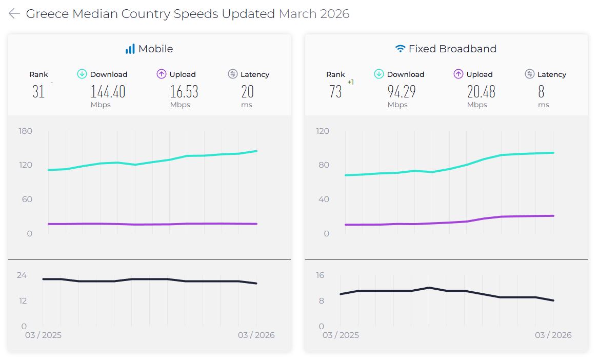 Σημαντική βελτίωση δείχνει να καταγράφει η Ελλάδα στις ταχύτητες σύνδεσης στο διαδίκτυο κατά τη διάρκεια του τελευταίου έτους, τόσο στα δίκτυα κινητής τηλεφωνίας όσο και στις σταθερές ευρυζωνικές συνδέσεις, σύμφωνα με τα νεότερα στοιχεία της Ookla που ενημερώθηκαν τον περασμένο Μάρτιο.