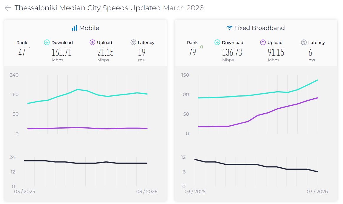 Στις σταθερές συνδέσεις, η πόλη ξεχωρίζει ιδιαίτερα, με 136,73 Mbps download, εντυπωσιακό upload 91,15 Mbps και latency μόλις 6 ms.